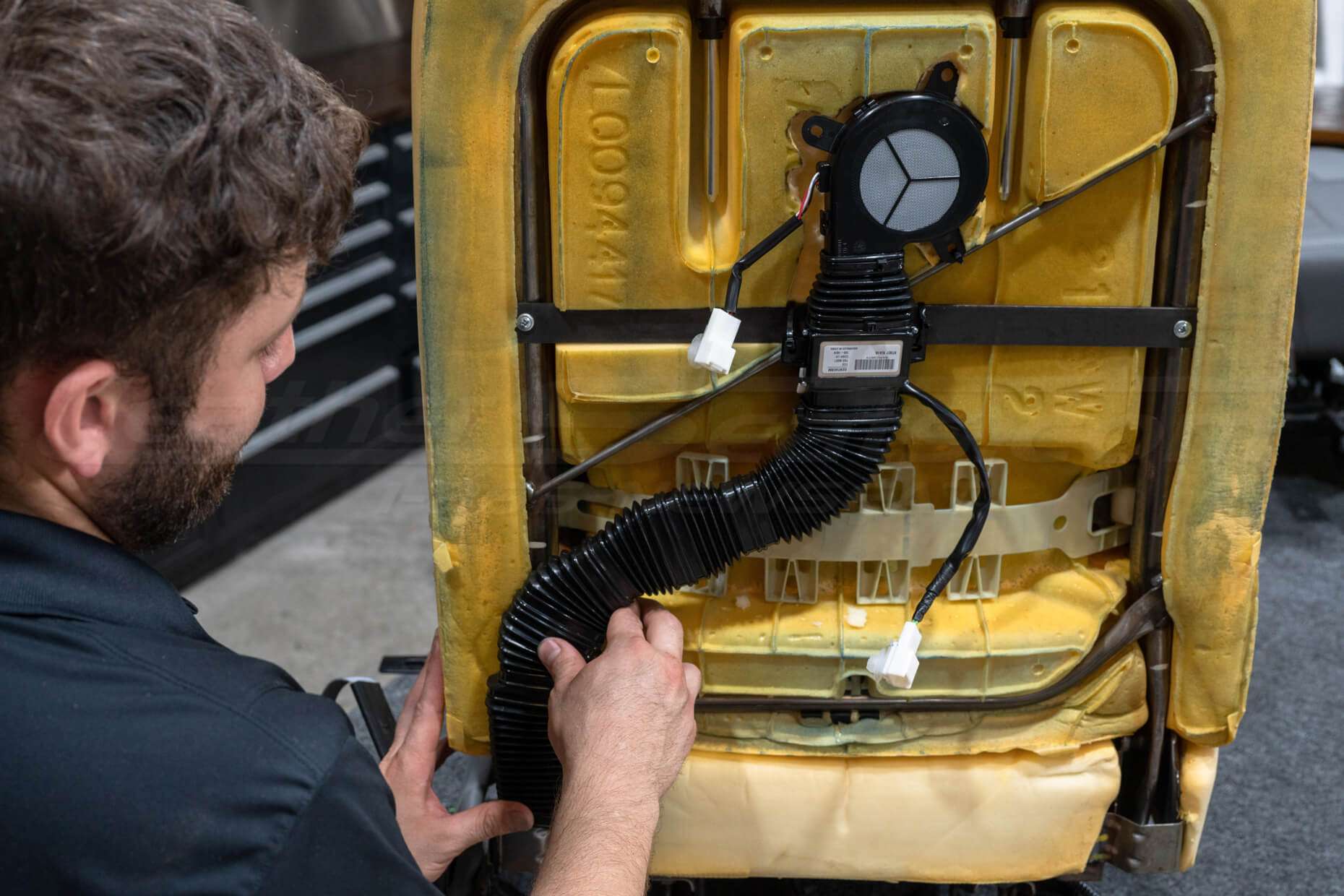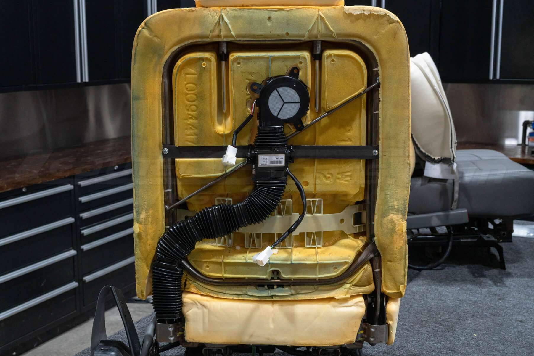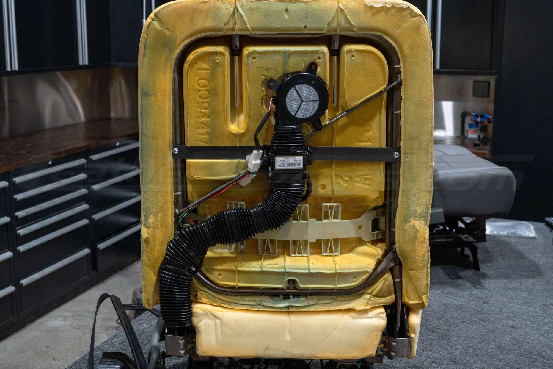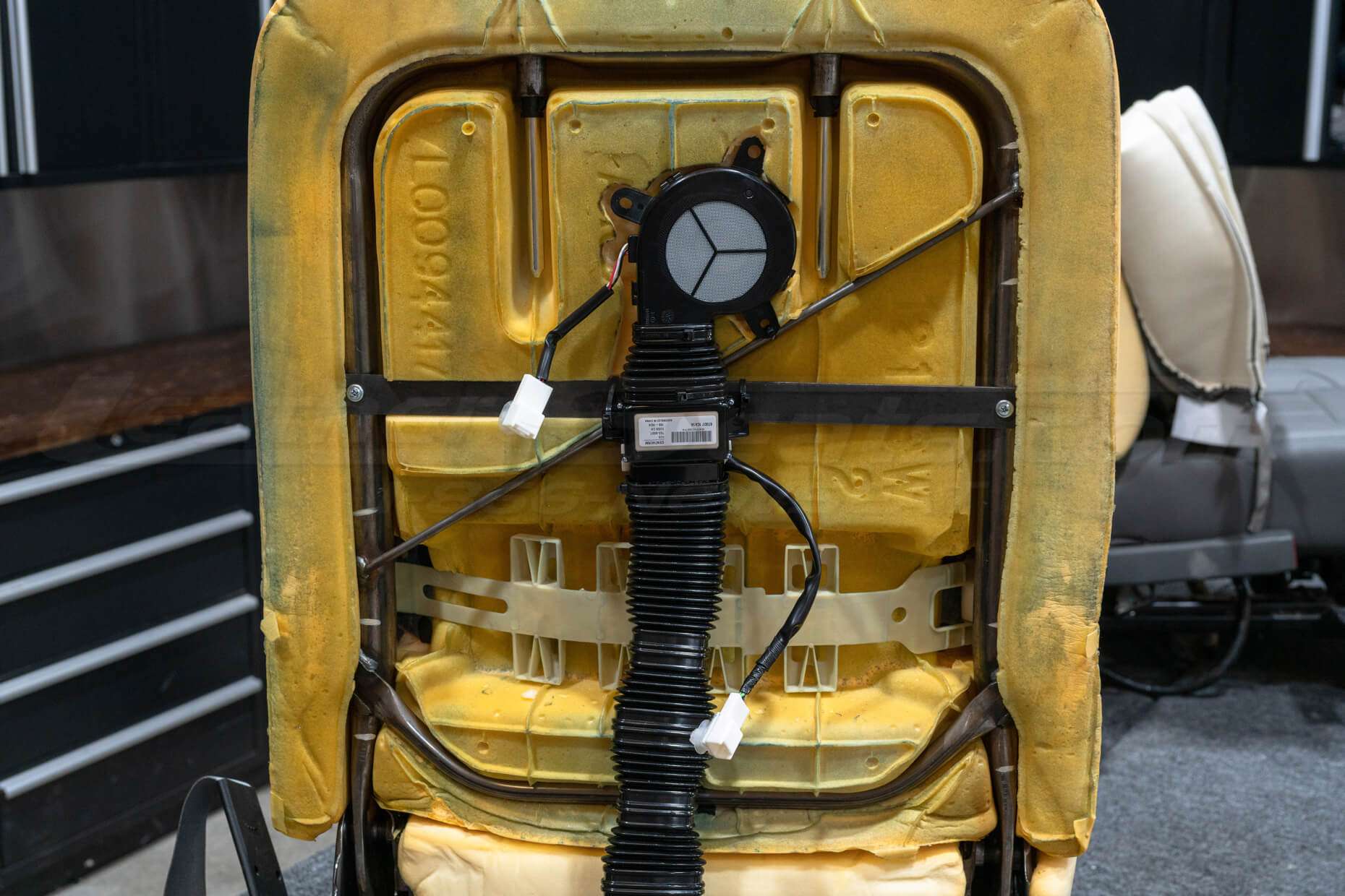 Some seat components may need to be modified to mount the TED and blower assembly. In this example, we modified the seat foam and added an additional bracket to the seat frame to mount the TED and blower assembly flush with the seatback.
