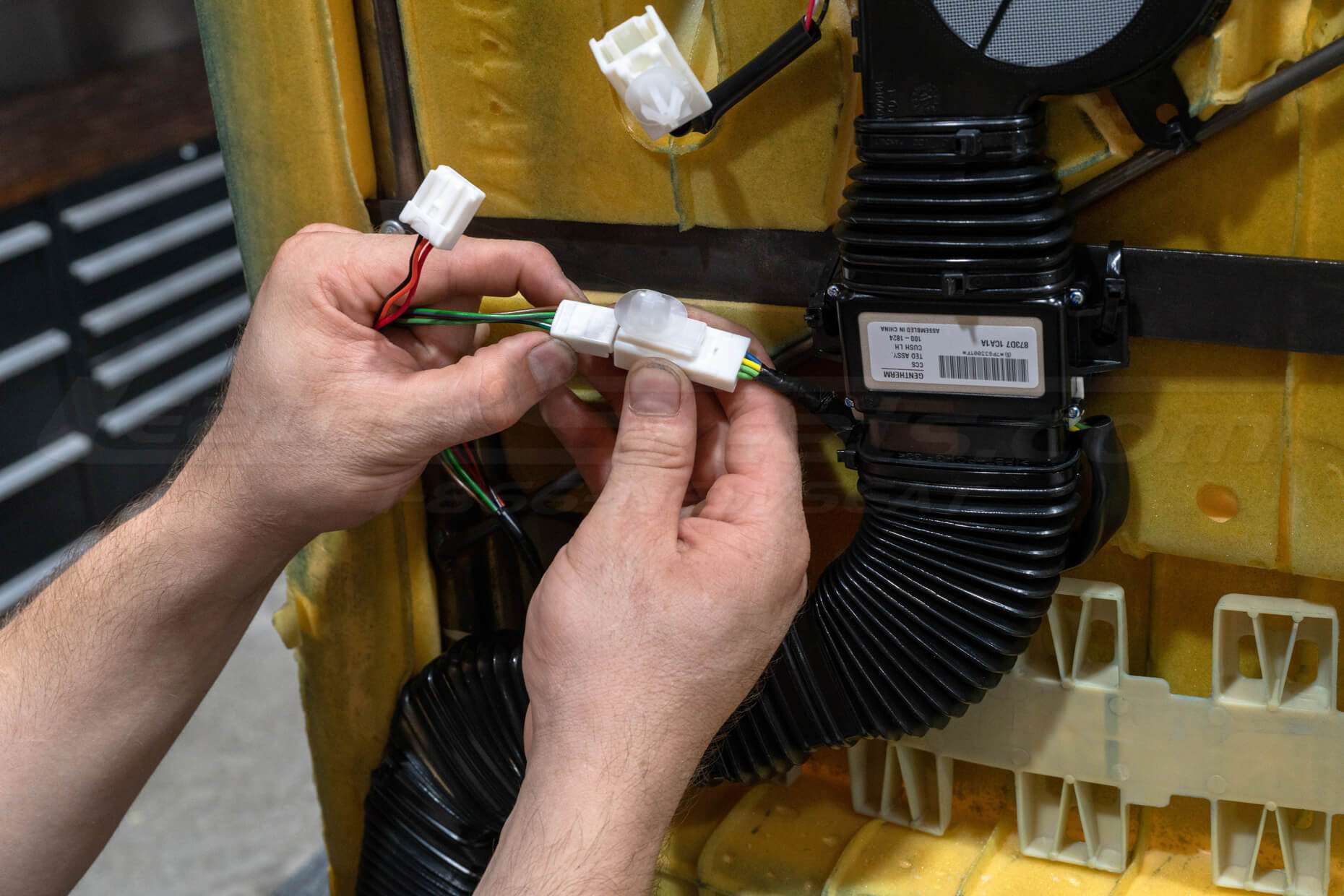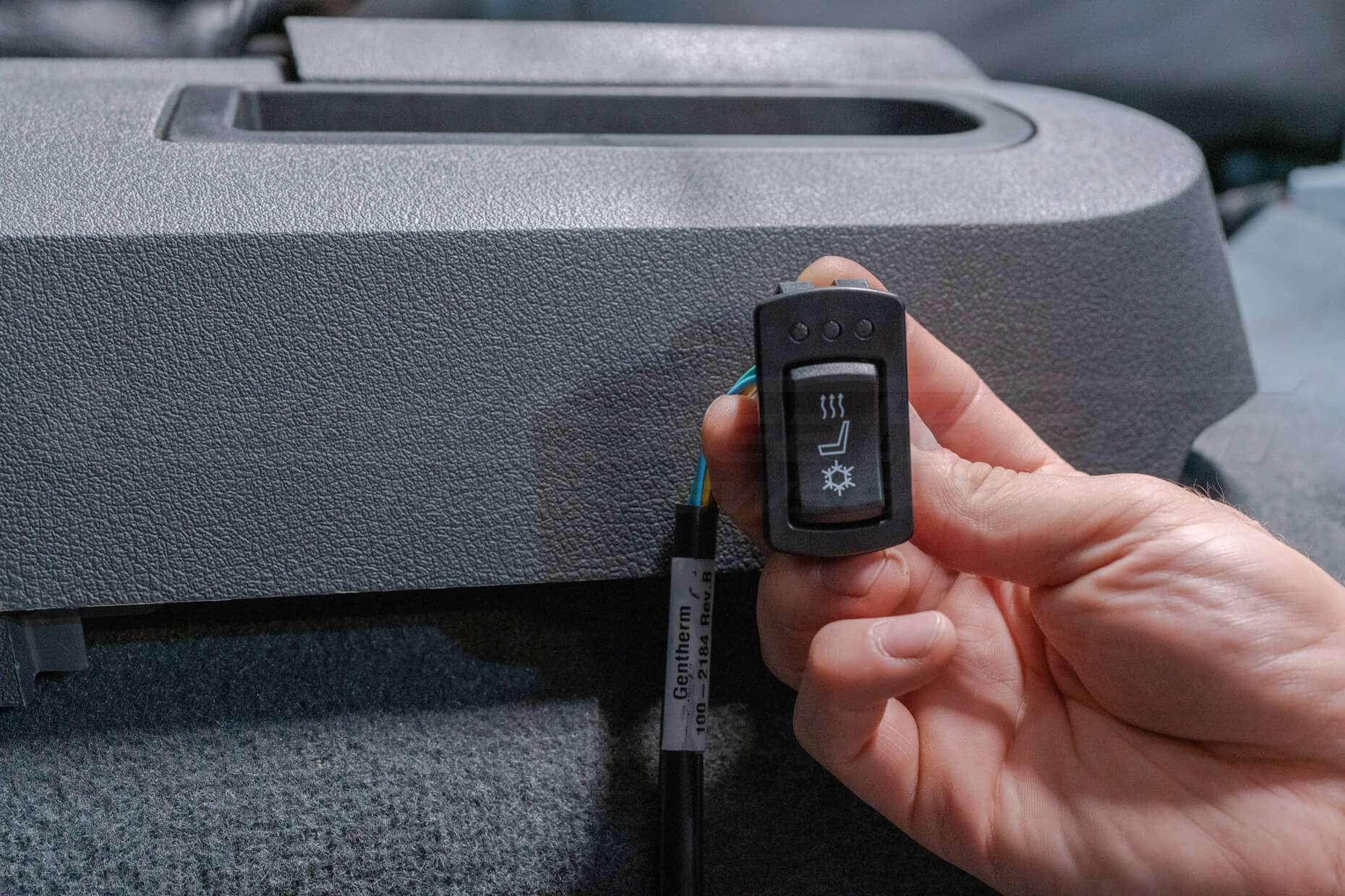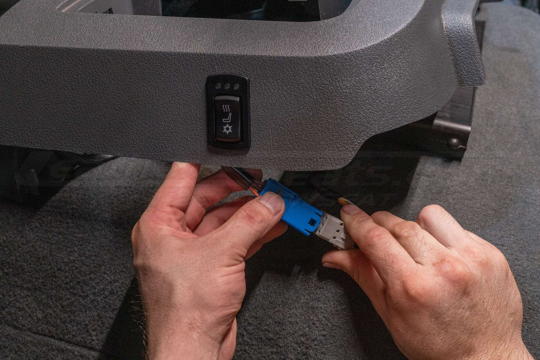 Reinstall seats into the vehicle, connect the switch to the seat’s wiring harness, and connect the power wiring harness to the seat’s wiring harness.