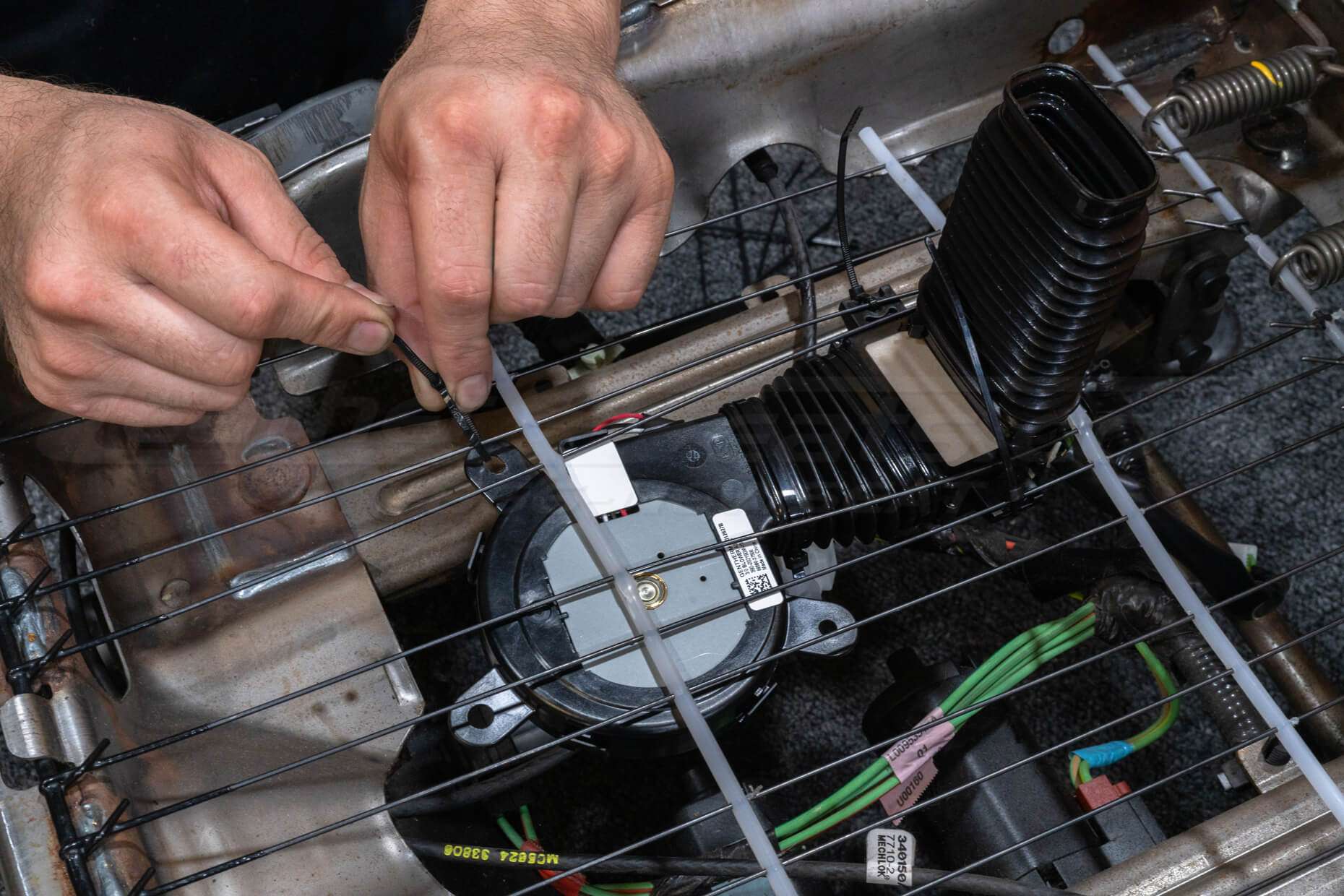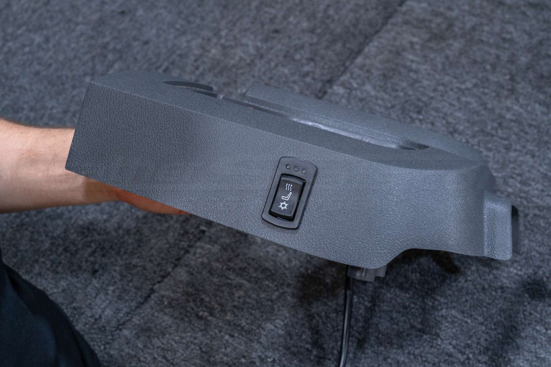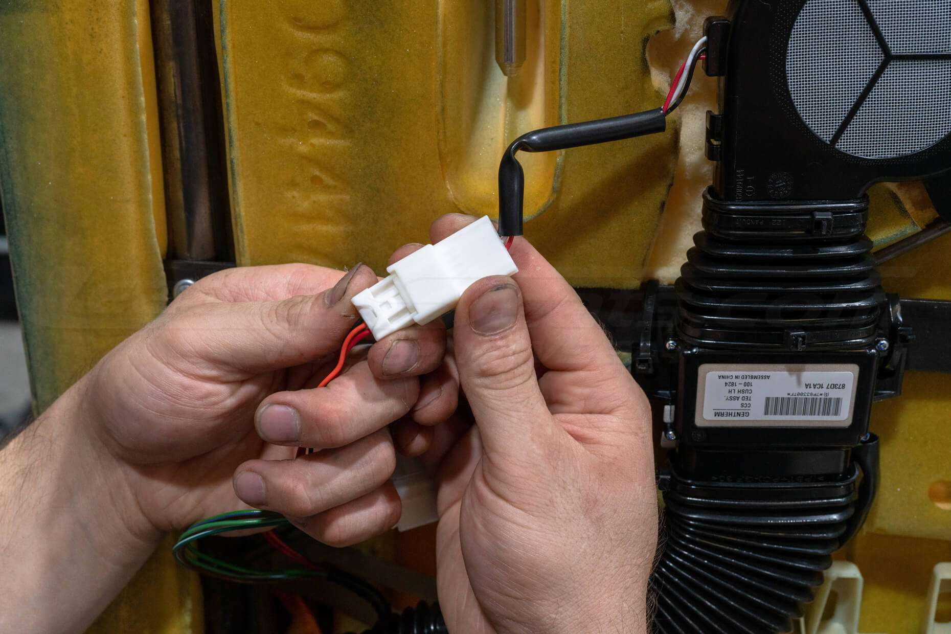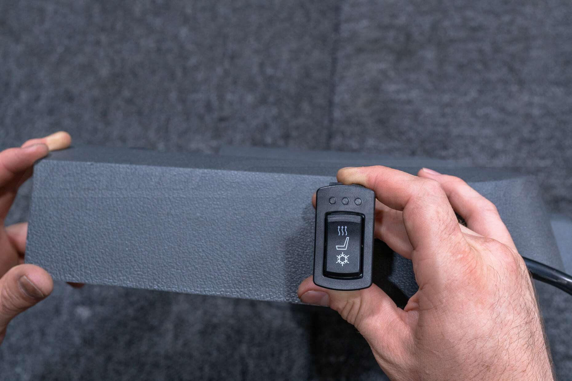Reinstall seats into the vehicle, connect the switch to the seat’s wiring harness, and connect the power wiring harness to the seat’s wiring harness.