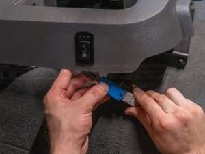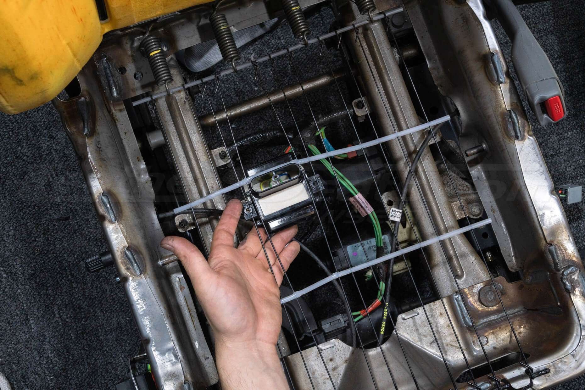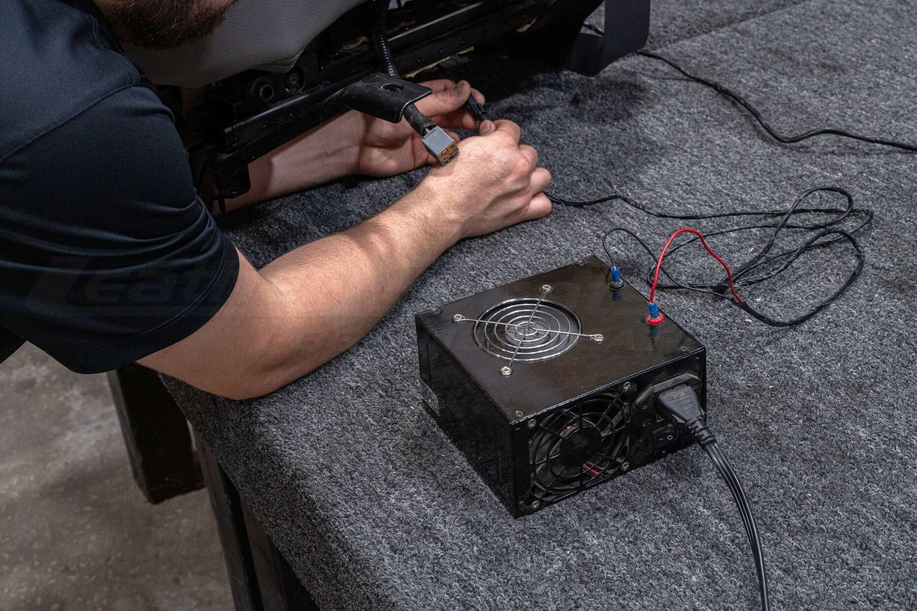Before removing the seats from your vehicle or servicing any electrical systems, disconnect the vehicle’s battery to ensure the working area is grounded. Unbolt the seats and unplug all power wires and connectors going into the seats. To help avoid scratching the interior plastics or door panels when removing the seats, we recommend covering the door and floorboard with blankets or towels.