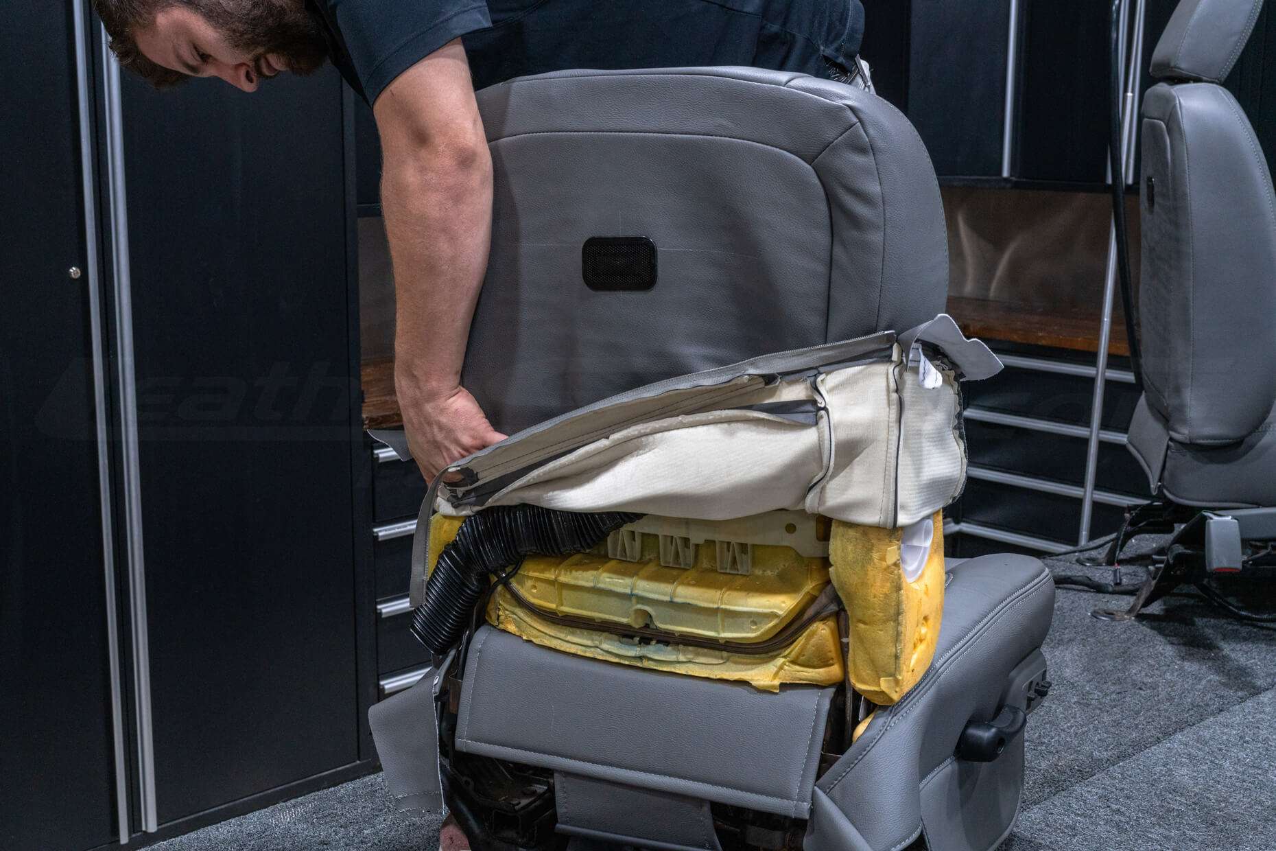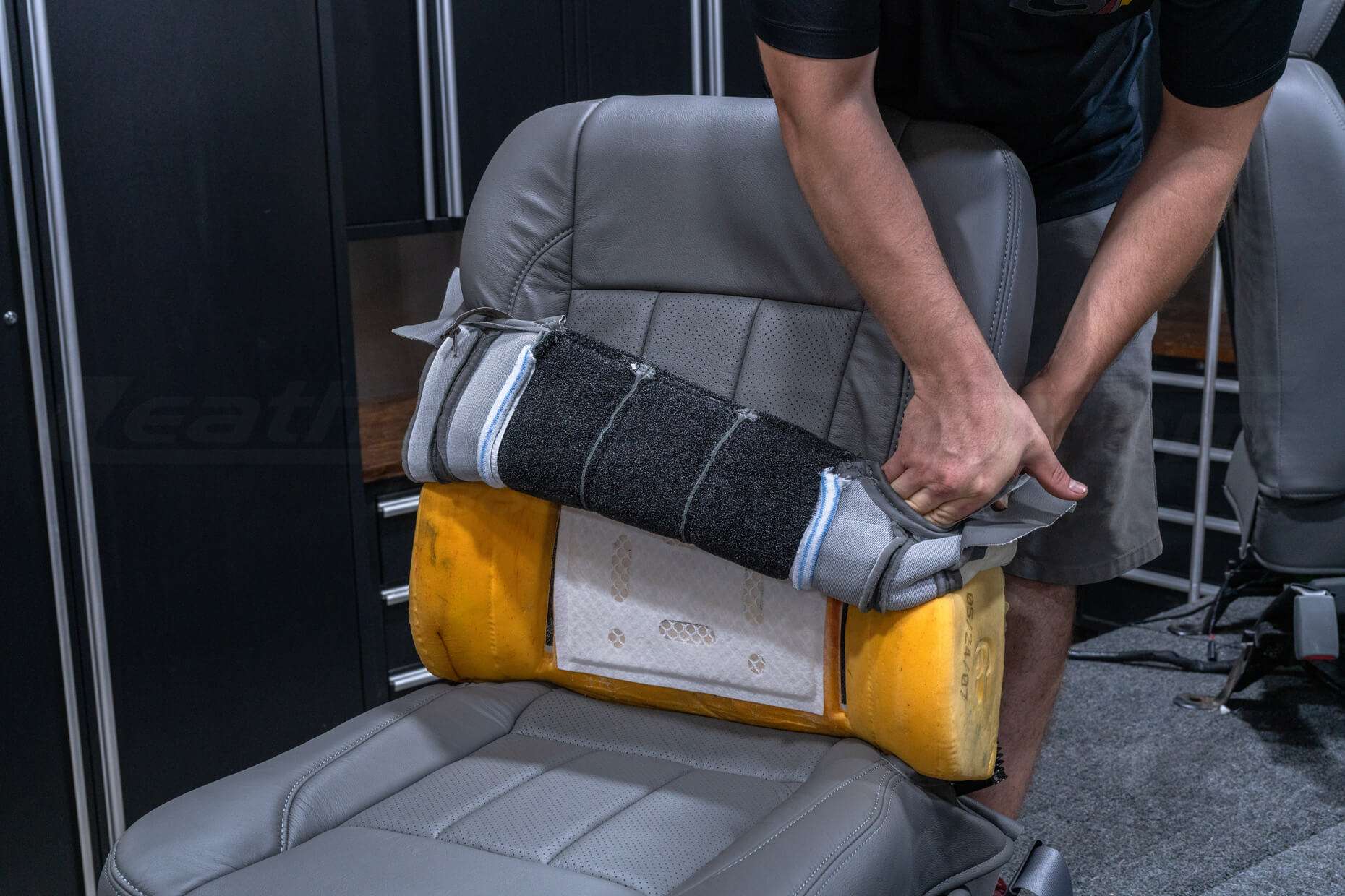 Removing the cloth or leather upholstery from the seats will vary with every vehicle and typically requires basic hand tools. You may also need to remove the side plastics to gain access to the upholstery attachment points. A good practice is to take notes and/or pictures of the seats throughout this process so that you know how everything goes back together when you go to reinstall the upholstery.