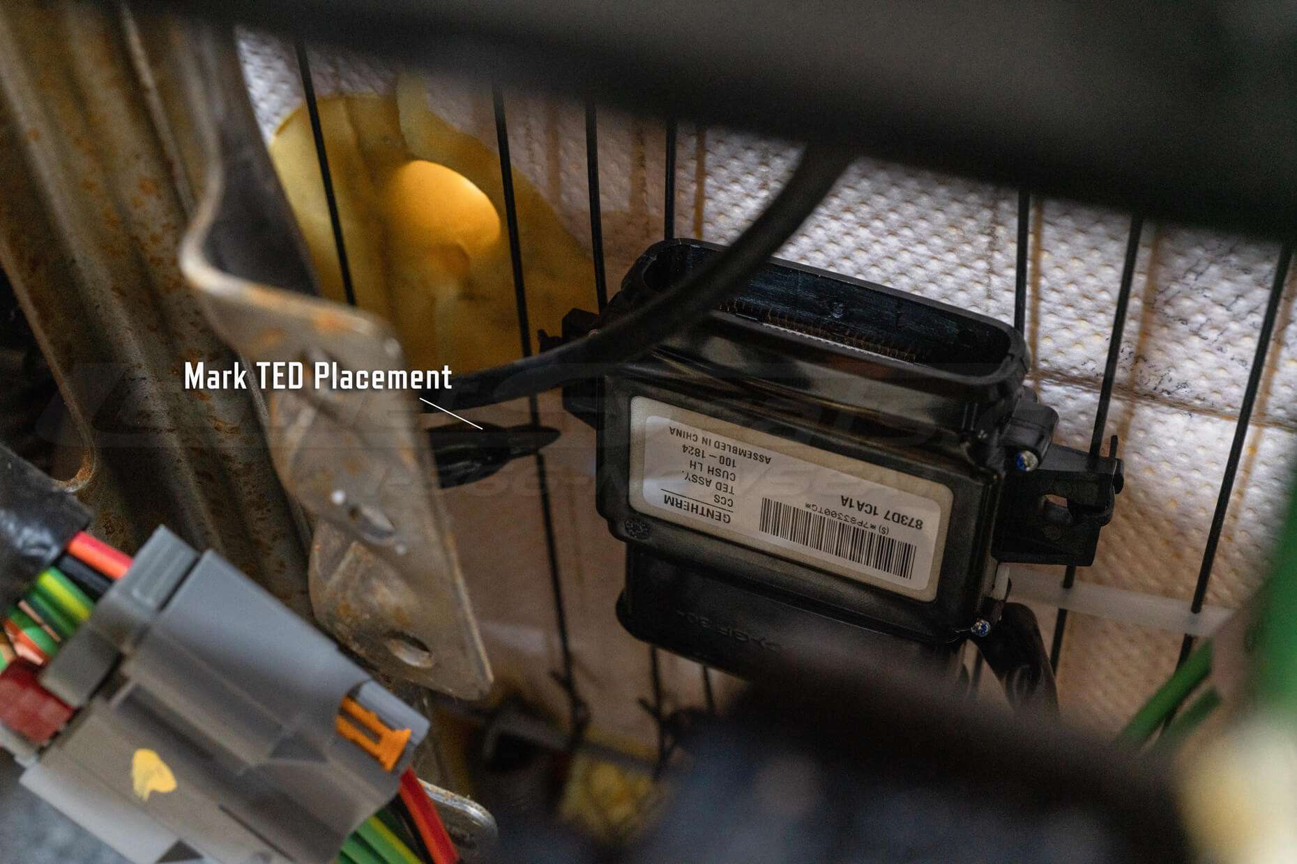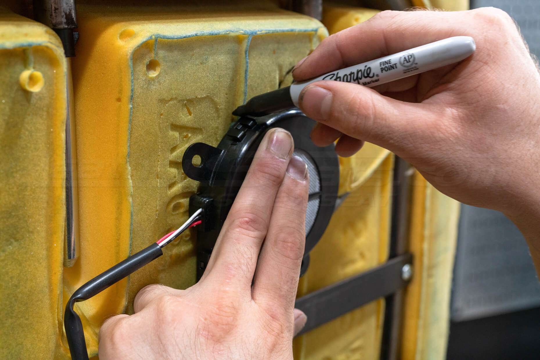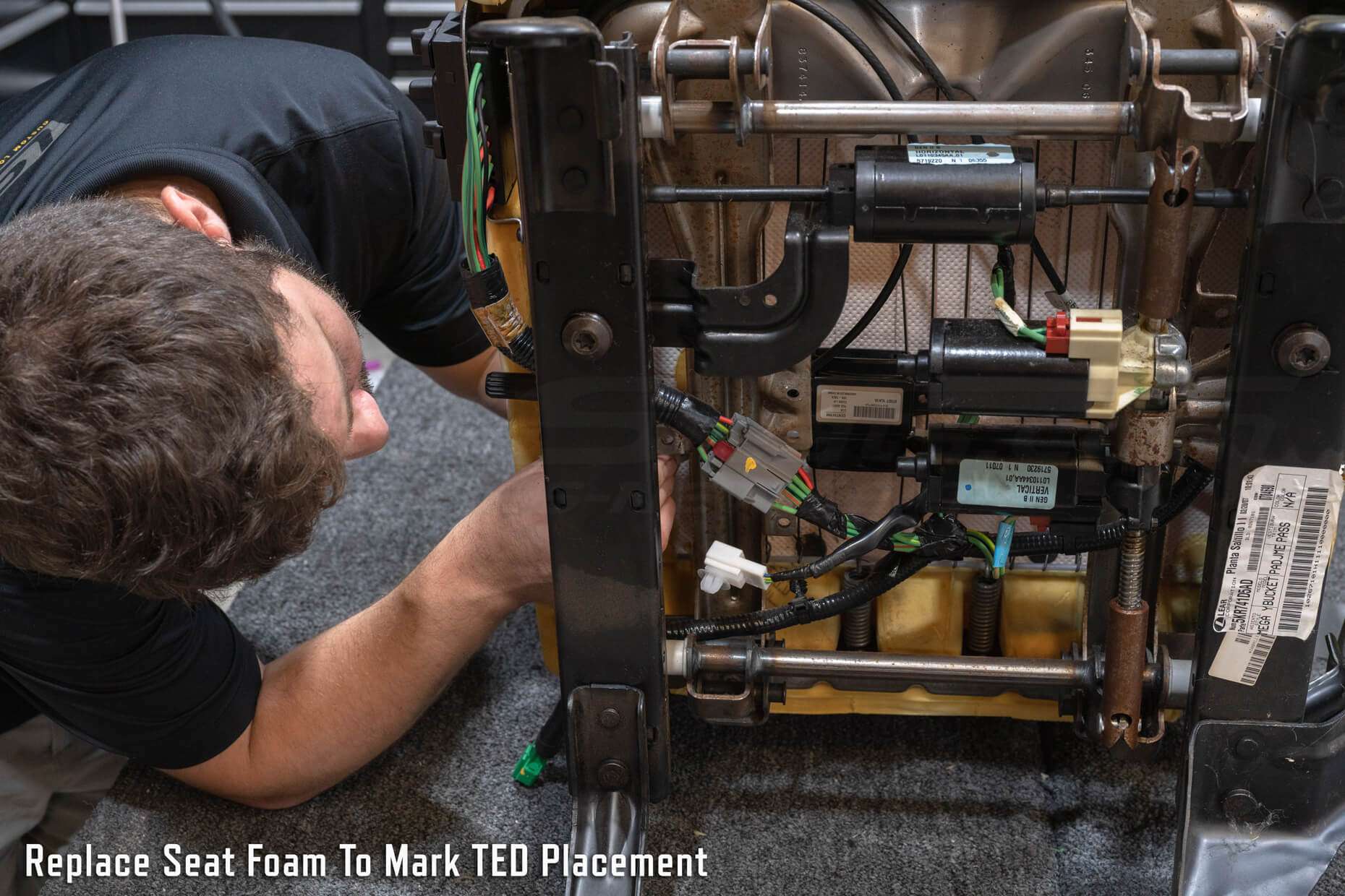 Temporarily attach the TED unit to the back/bottom of the seat, put seat foam back in place, and mark where the TED unit will connect.