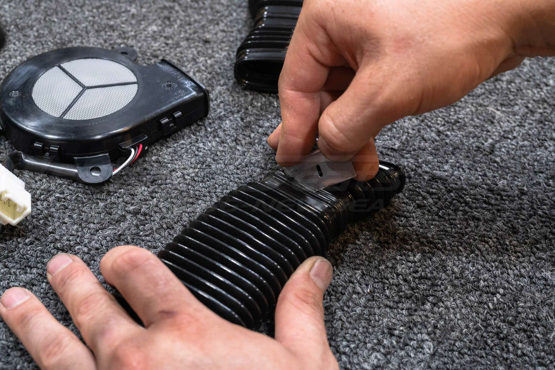 Modifications to the surface of the distribution pads are optional, however, we do recommend them. The logic to optimize airflow is to start from the TED output hole and work your way out. Keep the holes closest to the TED output smaller and make them larger as you move away. For later model F-150s, we have an example video that shows the modifications that we make to the distribution pads. This kind of modification does not require laser-cut precision like in the video, you can use a razor blade or sharp knife to cut the surface of the pad.