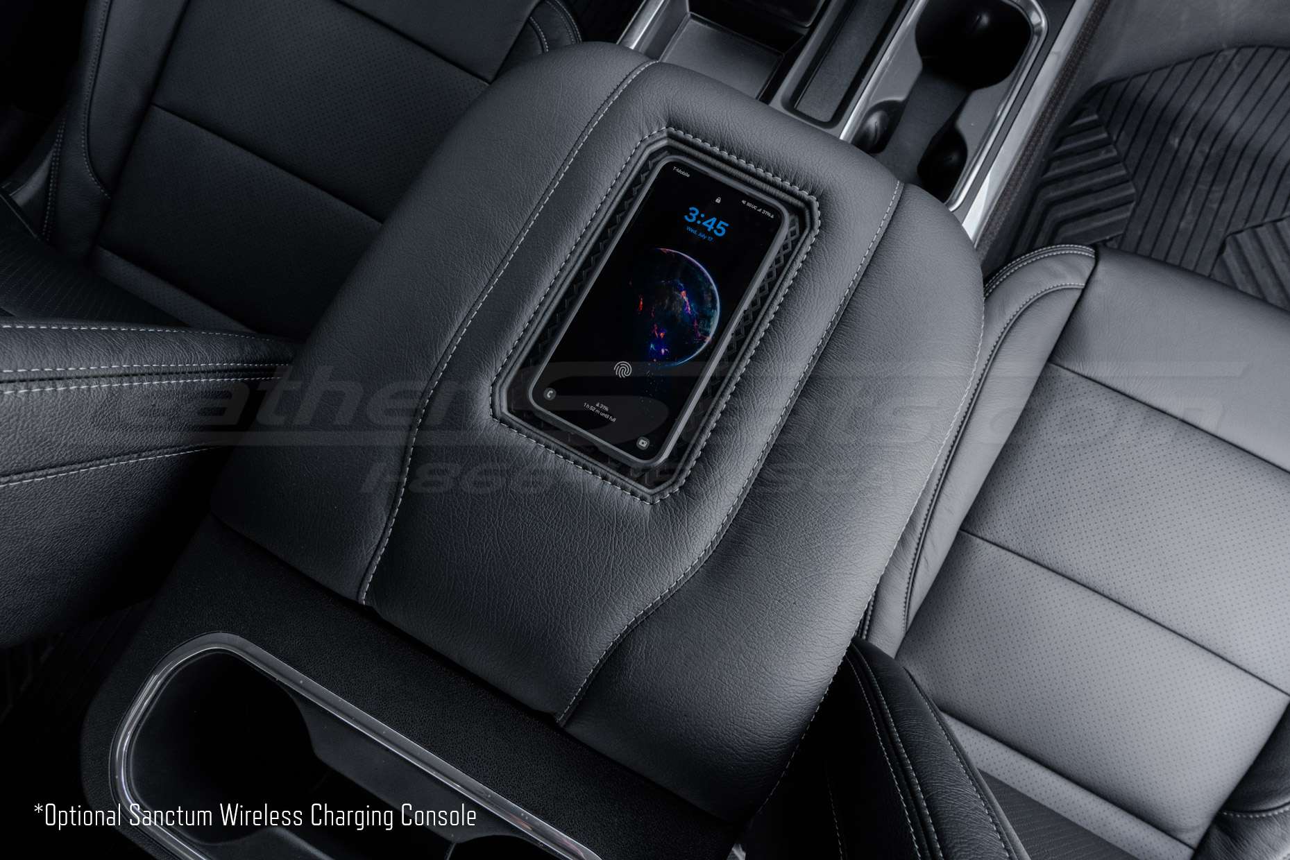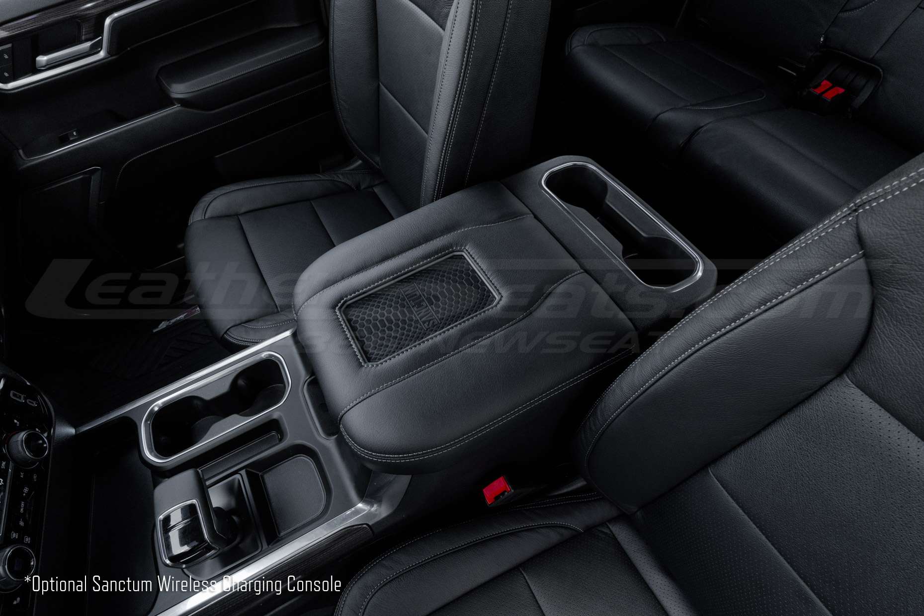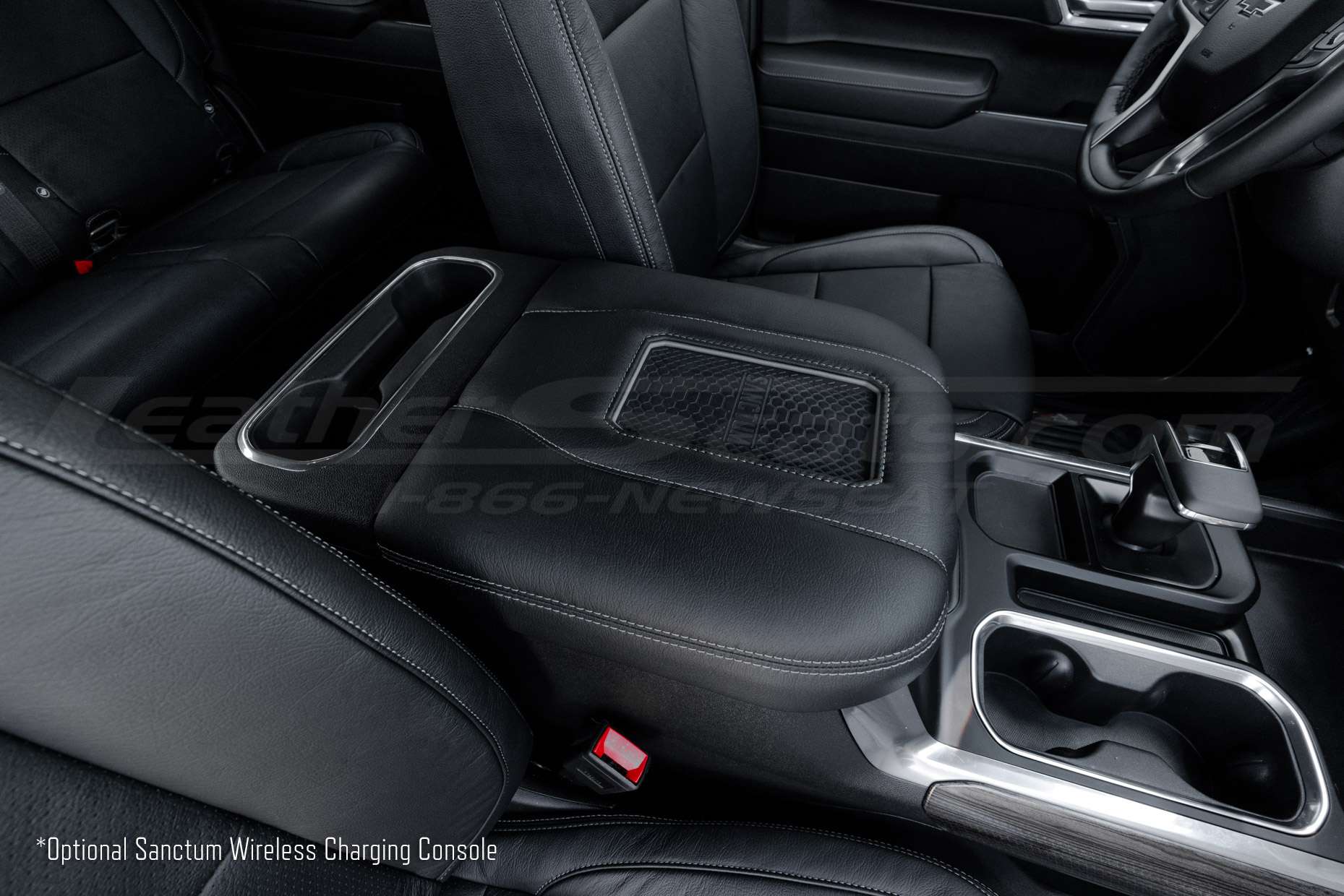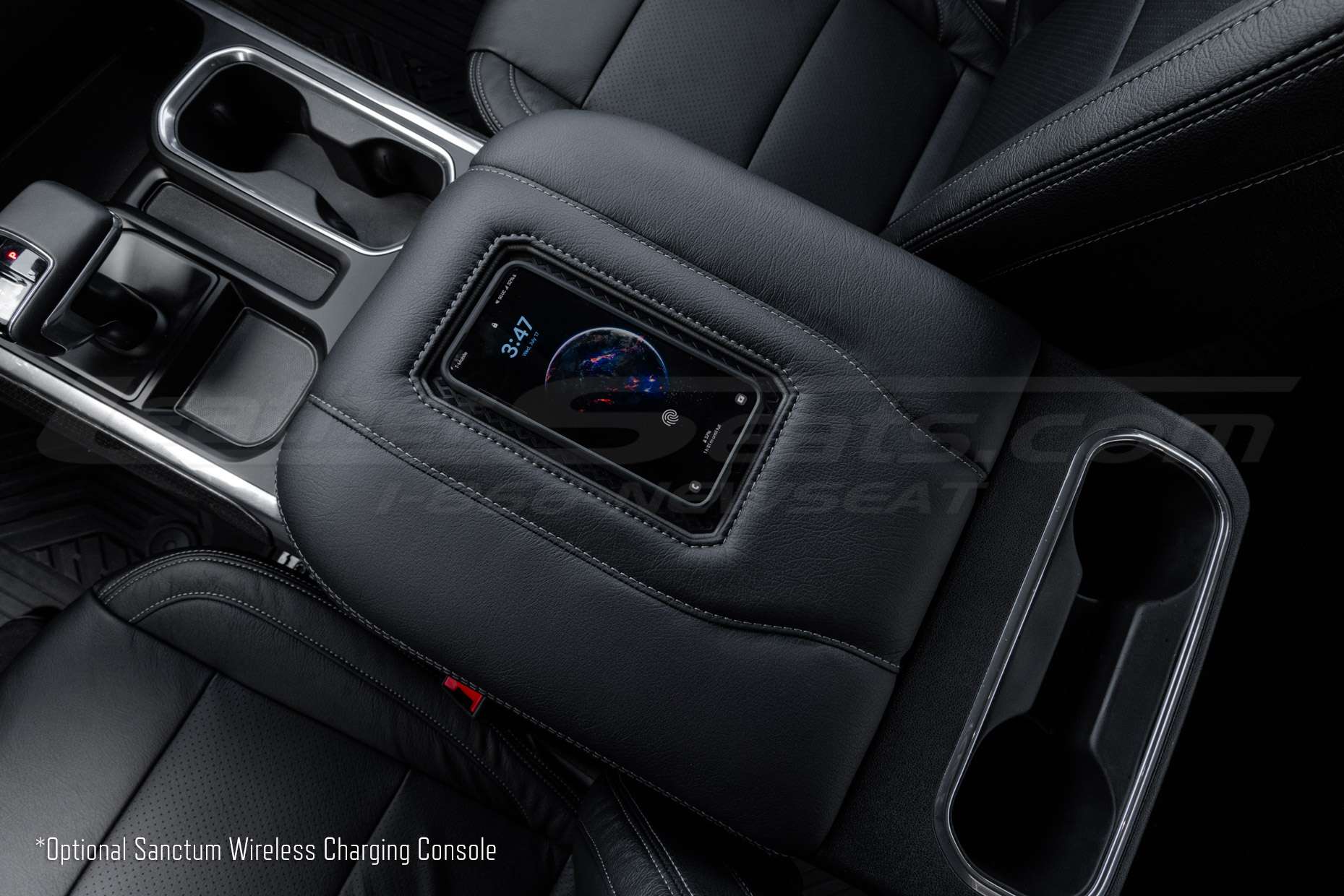 For a clean, factory look, this package comes pre-configured in Single-Tone Black with Perforated Inserts and contrast Lapis stitching. You can also order a Leather Console Lid Cover (Low Back Buckets) or Sanctum Wireless Charging Console to match the seat covers and complete the transformation.