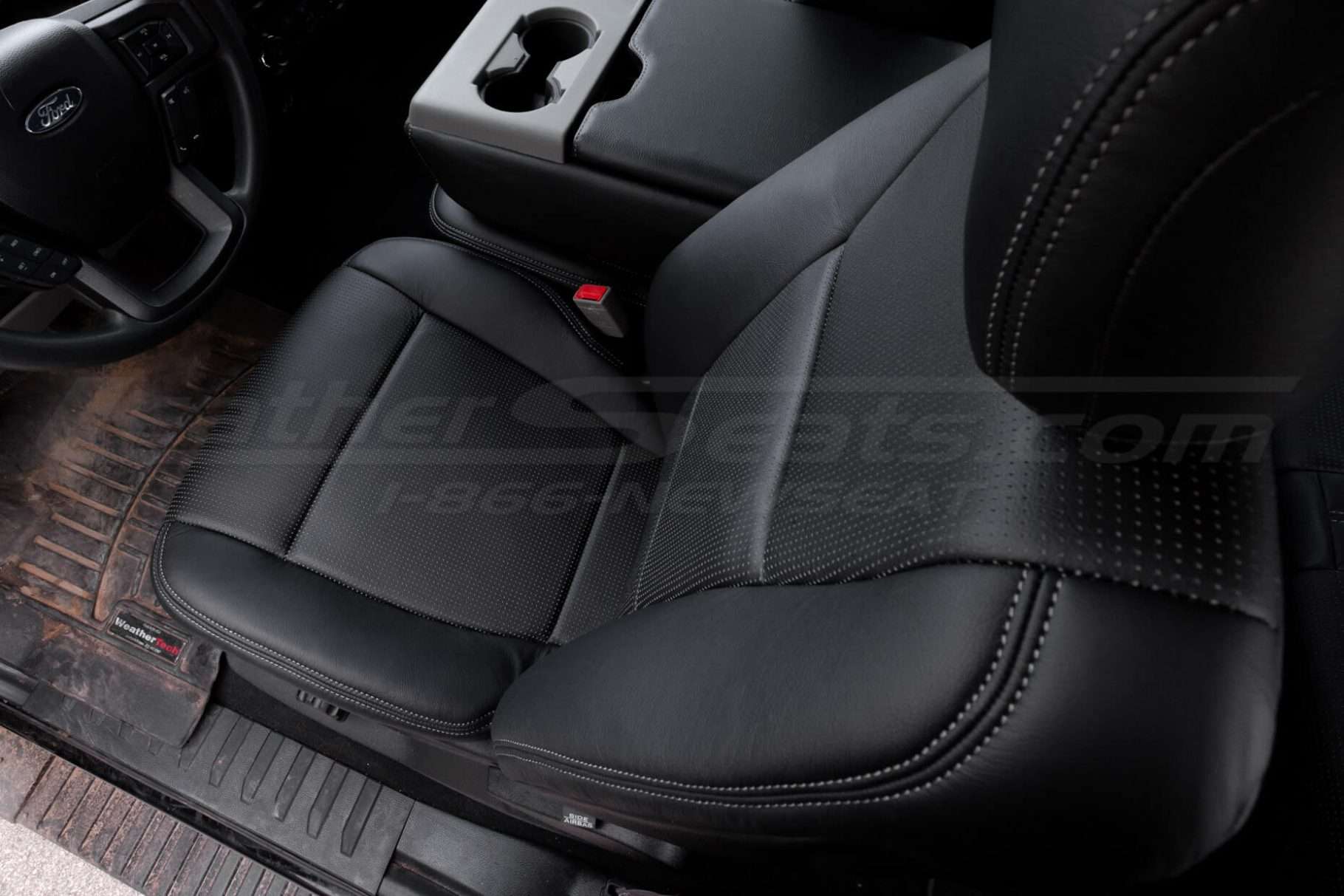 For a clean, custom look, this package comes pre-configured in Two-Tone Black with Piazza Grey Perforated Body and contrast Platinum stitching. You can also order a Leather Console Lid Cover or Sanctum Wireless Charging Console to match the seat covers and complete the transformation.